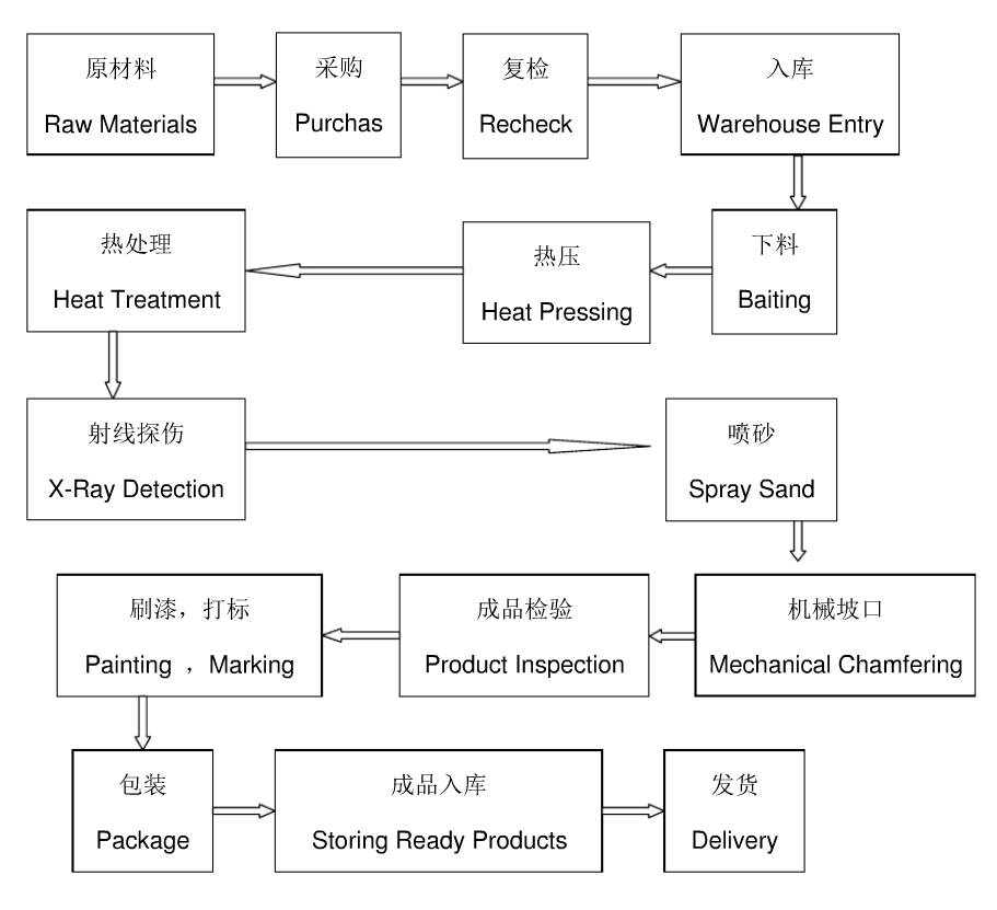 Raw Materials Into The Factory → Billet Cutting → Reel Pipe (Only In Seamed Pipe Fittings) → Welding (Only In Seamed Pipe Fittings) → Heating → Moul Ding → Heat Treatment → Machined Groove → Surface Treatment → Finished Product Inspection → Marking Protection → Put In Stock (Note: there is a pickling passivation process after stainless steel products groove processing) |